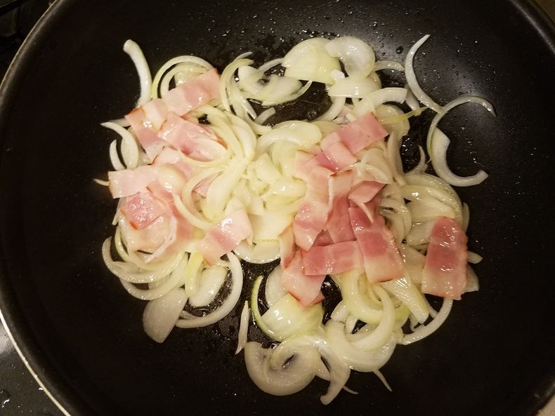 タマネギがしんなりするまで炒めた後にベーコンを加えて更に炒めます。